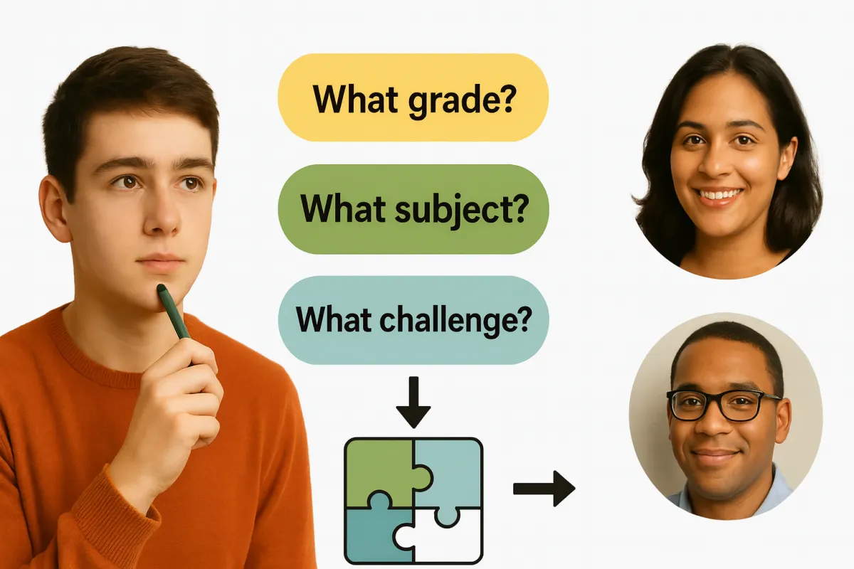 Answer a few quick questions so we can understand the subject, grade level, and specific challenges. This takes 2–4 minutes and helps us match you with the right specialist.